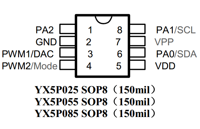 YX5P系列语音芯片,新增sop8 (150mil)的封装,体积更小,价格更低,性价比更高,目前有3款母体分别是:YX5P025  YX5P055 YX5P085  语音IC脚位相同,按照4bit 6k采样率计算分别可做25秒,55秒,85秒的内容,脚位图如下: