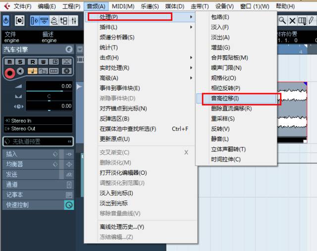 这一步我们在Cubase里实现,依次操作:“点选素材”-“音频”-“处理”-“音高位移”