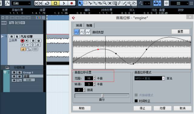 调出音高位移界面后,我们开始做音画同步了,具体做法如下图。首先确保能动态变化,我们需要选择“包络”,然后把音高位移设置的范围调到最大(16),最后在波形上打点,并根据视频时间轴来调整汽车变速情况。